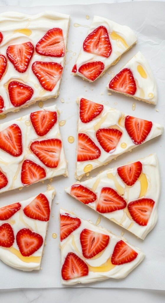 Spread 1 cup of plain Greek yogurt in a thin even layer across a parchment-lined plate. Arrange sliced fresh or frozen strawberries across the surface. Drizzle generously with honey. Freeze for 15–20 minutes until firm. Break into pieces and serve immediately. Budget tip: Plain Greek yogurt is considerably cheaper than flavored varieties. Frozen strawberries thawed briefly and patted dry work just as well as fresh for a fraction of the cost. Store broken pieces in a zip-lock bag in the freezer for up to one week. Swap strawberries for any berry you have available.