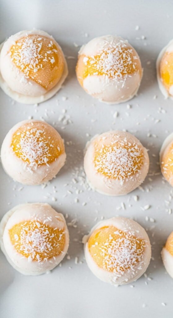 Blend 1 cup of frozen mango chunks until smooth and thick like soft-serve ice cream. Stir in 2 tablespoons of coconut cream until combined. Scoop into small mounds on parchment paper. Roll tops in fine desiccated coconut. Freeze for 10 minutes until firm. Budget tip: Frozen mango is available year-round at a much lower price than fresh. Canned coconut milk works perfectly — use just the thick cream from the top of the can. This dessert contains no added sugar beyond the natural sweetness of the fruit. Two servings cost under one dollar when made with these affordable staple ingredients.