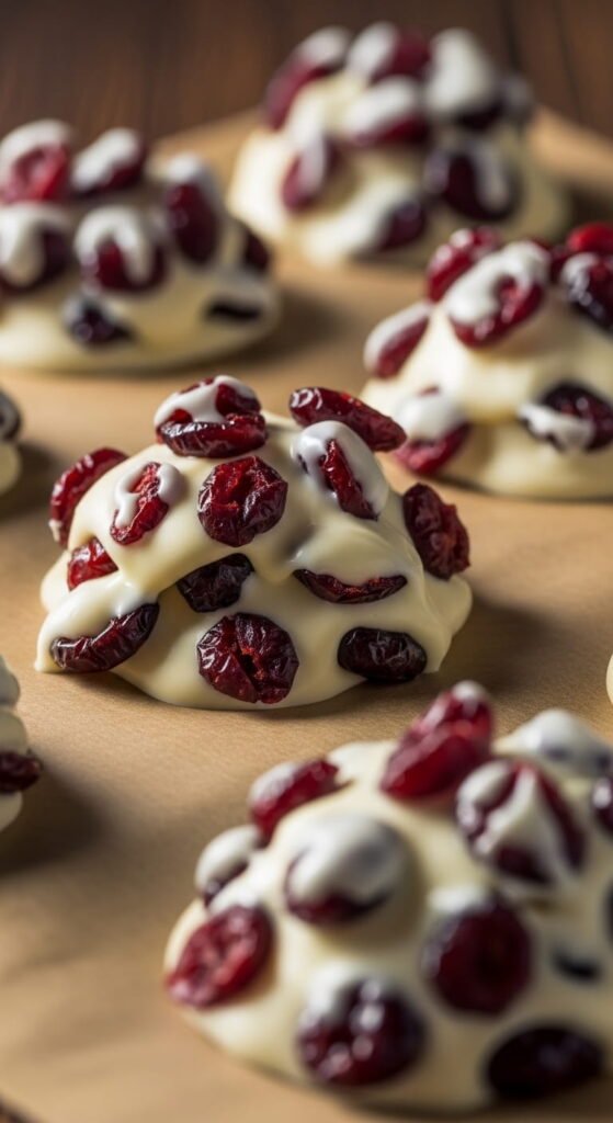 Melt 1 cup of white chocolate chips in the microwave in 30-second bursts, stirring between each. Stir in ¾ cup of dried cranberries until fully coated. Drop spoonfuls onto parchment paper. Let set at room temperature for 10 minutes or place in the freezer for 5 minutes. Budget tip: Dried cranberries are widely available in affordable bulk bags — they keep for months in the pantry and work in dozens of recipes. Store-brand white chocolate chips melt cleanly and taste excellent. Swap cranberries for raisins, dried cherries, or dried apricots depending on what you have available in your kitchen already.