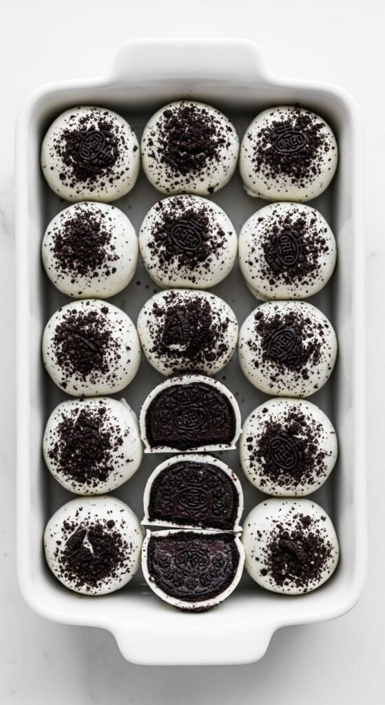 Crush 20 Oreo cookies into fine crumbs in a zip-lock bag. Mix thoroughly with one 8-ounce block of softened cream cheese until a smooth dark dough forms. Roll into balls. Dip in melted white chocolate and let set on parchment. Refrigerate for 5 minutes. Budget tip: Generic sandwich cookies work just as well as brand-name Oreos and often cost half the price. Melted white chocolate chips are more affordable than specialty coating wafers. One block of cream cheese and a standard pack of cookies makes roughly 30 balls — an excellent value for any gathering.