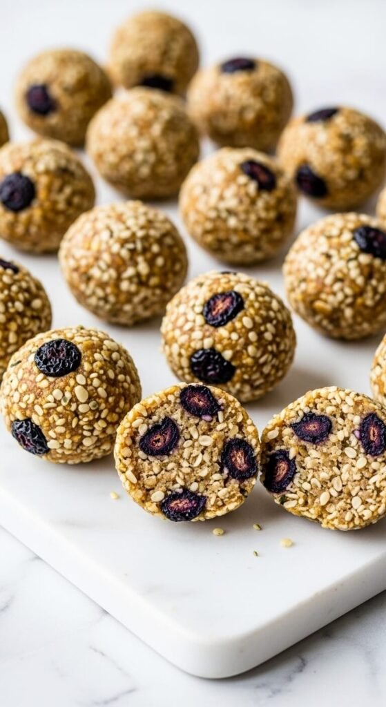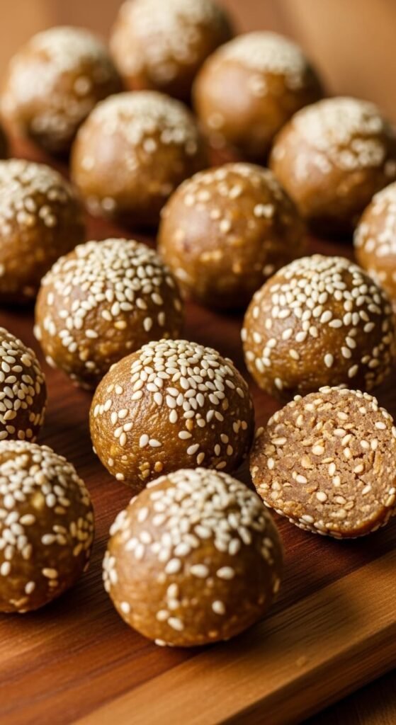 Medjool dates, tahini, rolled oats, cinnamon, and vanilla produce a naturally sweetened ball with a caramel-like sweetness from the dates and a complex, nutty depth from the tahini. Process pitted Medjool dates until they form a rough paste. Add tahini, oats, cinnamon, and vanilla. Process until the mixture holds together when pressed. Roll into balls and immediately coat in sesame seeds — press the seeds lightly into the surface so they adhere completely. The sesame coating adds crunch against the dense interior and visually distinguishes these balls from standard date balls. Budget tip: buying Medjool dates from bulk bins saves about 40% compared to pre-packaged bags.