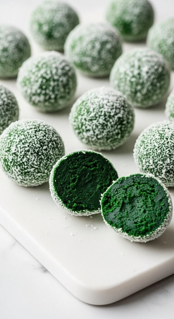 Rolled oats, cashew butter, honey, vanilla, and spirulina powder produce the most visually striking ball in this list — a vivid, bright green exterior that generates immediate curiosity before anyone tastes them. Use one teaspoon of spirulina per batch — more than that produces a seaweed-forward flavor that most people find unpleasant. At one teaspoon, the flavor is mild and grassy, completely masked by the cashew butter and honey. The vivid green color is entirely natural. Roll in finely shredded coconut for a white exterior that contrasts dramatically with the green interior revealed when a ball is cut. Makes 18 balls for about $5.