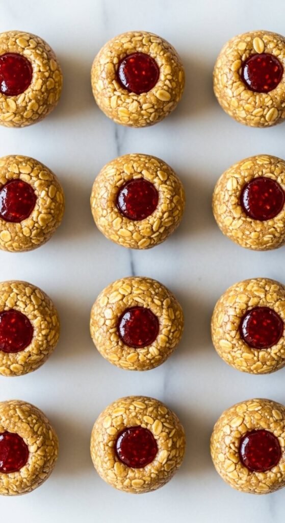 The classic PB&J flavor combination in energy ball form — peanut butter oat mixture rolled into balls with a strawberry jam center pressed into each one using the back of a small measuring spoon. Make the standard peanut butter oat ball mixture. Roll into balls. Create a small indent in each ball using your thumb or a small spoon. Fill with ¼ teaspoon of seedless strawberry jam. The jam should sit in the indent rather than be covered — the visible red center signals the flavor clearly. Refrigerate 30 minutes until the jam firms slightly. Budget tip: one standard jar of store-brand jam costs about $2 and provides enough for 40 to 50 ball centers.