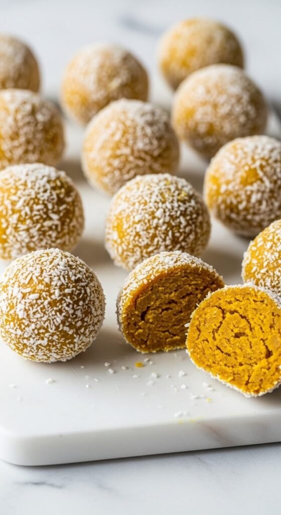 Rolled oats, cashew butter, honey, turmeric, ginger, cinnamon, and black pepper produce a golden ball with anti-inflammatory spices in proportions that taste warm and aromatic rather than medicinal. The black pepper is the essential but invisible ingredient — one pinch activates the absorption of turmeric compounds and adds a gentle warmth. Use ½ teaspoon of turmeric, ½ teaspoon of ginger, ¼ teaspoon of cinnamon, and a pinch of black pepper per batch. Roll in shredded coconut. The natural golden-yellow color from the turmeric creates a visually distinctive ball that signals the warming spice profile before the first bite.