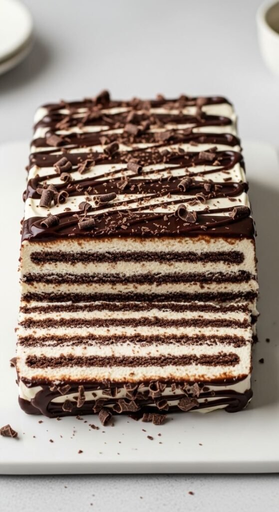 The original icebox cake — alternating Nabisco Famous Chocolate Wafers and sweetened whipped cream in a loaf pan, refrigerated overnight, and unmolded to reveal perfectly striped layers that have been making people gasp at summer tables since the 1920s. Whip two cups of heavy cream with three tablespoons of powdered sugar and one teaspoon of vanilla to firm peaks. Layer cookies and cream in a plastic wrap-lined loaf pan. Wrap completely and refrigerate overnight — the minimum time required for the cookies to soften fully into cake-like layers. Unmold, peel the plastic, and add a ganache drizzle. The overnight rest is non-negotiable. Budget tip: store-brand chocolate wafer cookies at half the price produce identical results.