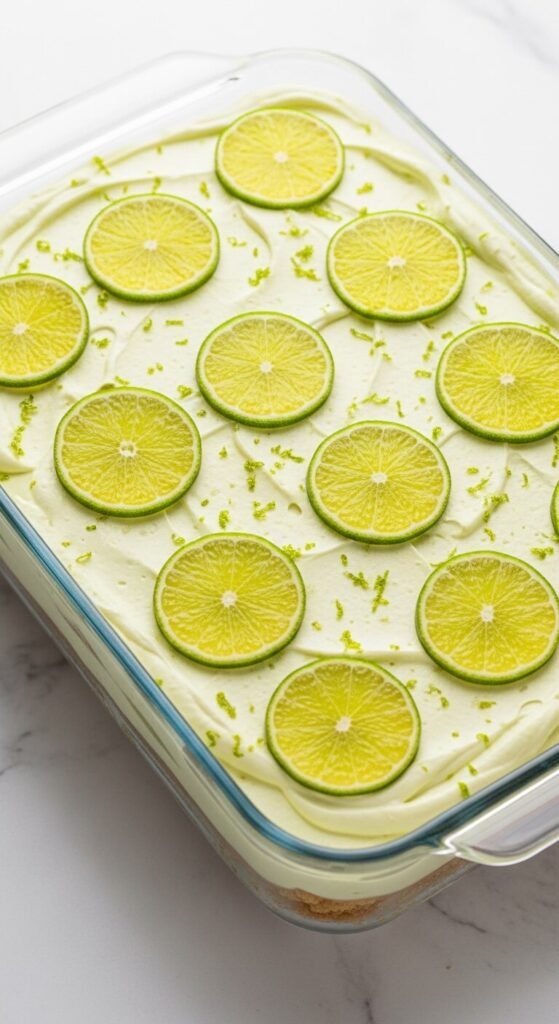 Key lime cream and graham crackers in alternating layers produce an icebox cake that tastes exactly like key lime pie in a format that serves 16 without any slicing anxiety. Make the key lime cream by folding three tablespoons of key lime juice and one tablespoon of lime zest into two cups of whipped cream and 4 oz of softened cream cheese. The tartness of the lime juice cuts through the cream richness and produces the right tart-sweet balance. Layer with graham crackers in three complete cycles. Refrigerate overnight. Top with thin lime wheel slices and additional lime zest. The pale green cream against the golden graham layers is a naturally beautiful summer color combination.