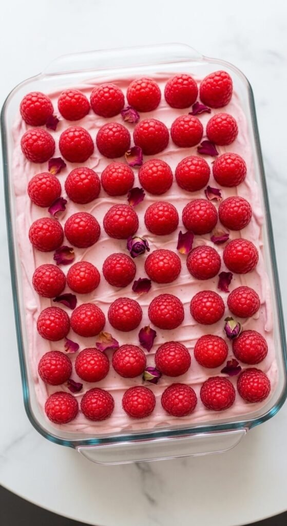 Vanilla wafers, rose water cream, and fresh raspberries in alternating layers produce a floral, lightly exotic icebox cake that stands out from every other summer dessert on a table. Add one tablespoon of rose water to two cups of sweetened whipped cream — start with two teaspoons and taste before adding more, since rose water intensity varies between brands. The rose cream carries a subtle floral note through every layer. Cover the top completely with fresh raspberries in tight concentric rows. Press a few dried rose petals between the raspberry rows for visual distinction. Budget tip: one small bottle of rose water costs about $3 and handles eight to ten batches of cream.