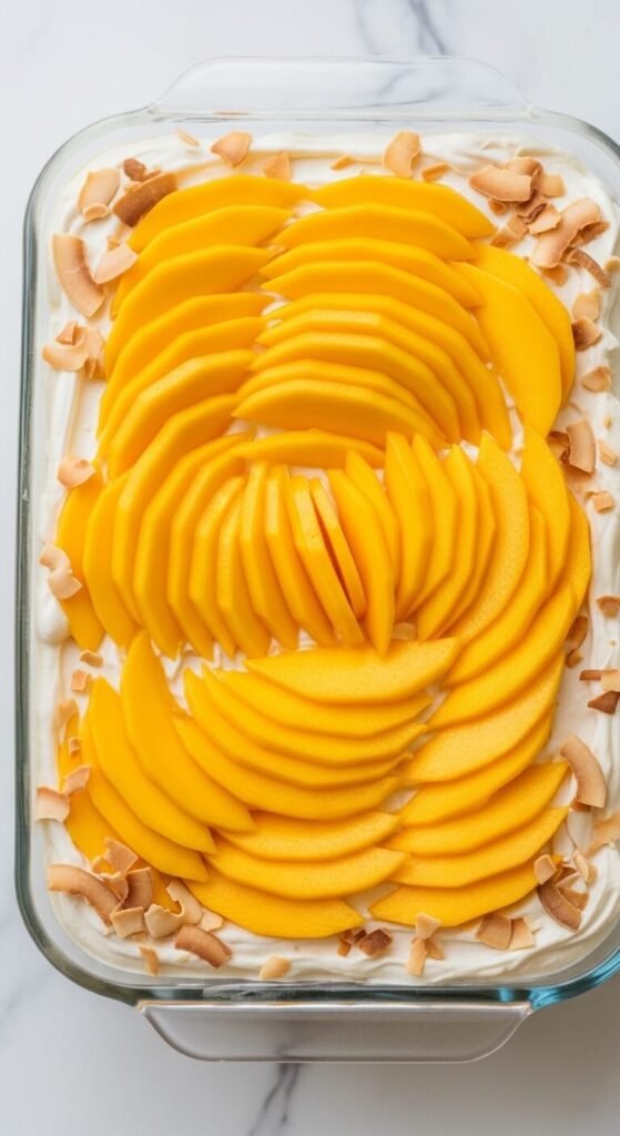 Coconut cream layers, thin mango slices, and vanilla wafers in alternating cycles produce a tropical icebox cake with a warm-weather flavor profile that feels genuinely vacation-worthy at any backyard table. Use ripe Ataulfo mangoes — sometimes called champagne mangoes — for the most tender, less fibrous slices and the sweetest flavor. Make the coconut cream from coconut cream beaten with powdered sugar and vanilla to firm peaks. Refrigerate overnight. Top with overlapping mango slices arranged in a spiral from the dish edge to the center. Brush with warmed, thinned apricot jam for a glaze. Budget tip: canned coconut cream costs about $2 per can and produces cream for two full batches.