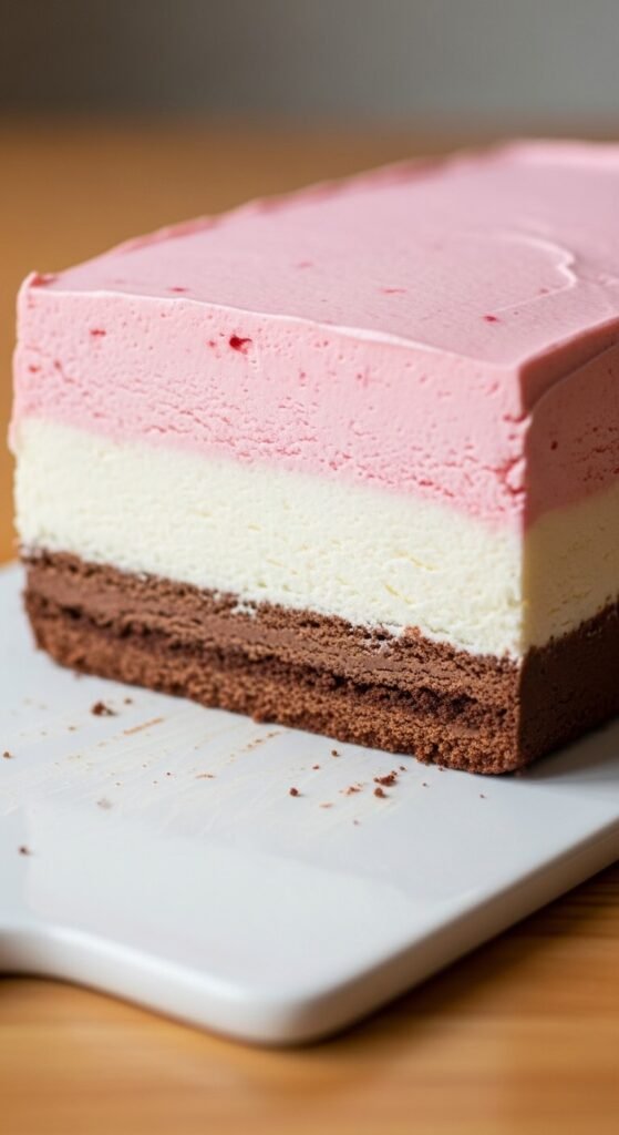 Three distinct cream layers — chocolate, vanilla, and strawberry — over chocolate wafer cookies produce a Neapolitan icebox cake where the three-color cross-section is the visual payoff of the assembly effort. Make three separate cream batches: plain vanilla, chocolate (add two tablespoons of cocoa), and strawberry (fold in two tablespoons of strained strawberry puree with pink food coloring). Layer chocolate wafers with the chocolate cream for the base cycle, vanilla cream for the middle cycle, and strawberry cream for the top cycle. Each cream layer must be visually distinct. Refrigerate overnight. The three-color cross-section when sliced is one of the most satisfying dessert reveal moments in this list.