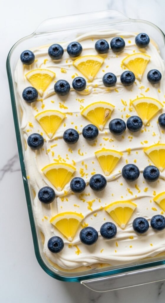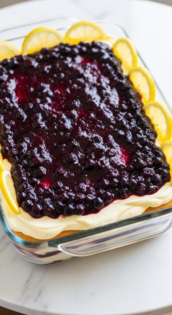 Lemon cream, Nilla wafers, and warm blueberry compote poured over the top just before serving — the compote is the element that takes this version from standard lemon icebox cake to something genuinely spectacular. Make the lemon cream by adding two tablespoons of lemon curd and one tablespoon of zest to sweetened whipped cream and cream cheese. Layer with Nilla wafers. Refrigerate overnight. Pour the blueberry compote — simmered blueberries, sugar, lemon juice, and cornstarch thickened to a glossy consistency — across the entire top surface just before serving. The vivid purple-blue compote against the pale yellow lemon cream is one of the most naturally striking dessert color contrasts possible.