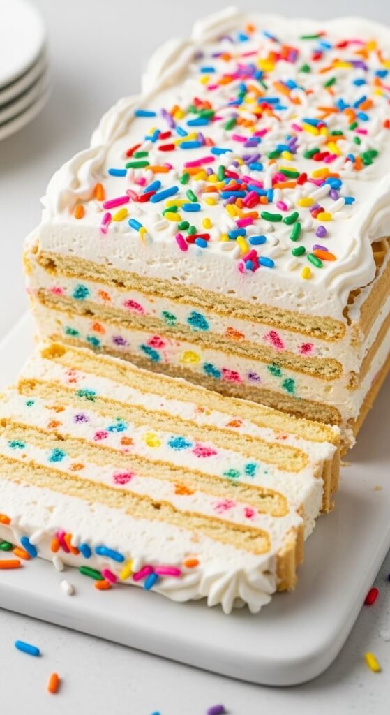 Vanilla wafers, vanilla cream loaded with rainbow sprinkles, and a sprinkle-covered top produce the birthday celebration icebox cake — the version that replaces a traditional layer cake at birthday parties for people who want maximum festivity with zero baking effort. Fold ½ cup of rainbow jimmies into two cups of sweetened vanilla cream before layering. Use jimmies rather than nonpareils — nonpareils bleed color into the cream and turn it gray. Layer with Nilla wafers in three complete cycles. Refrigerate overnight. Top with additional whipped cream rosettes piped around the perimeter and a dense scatter of sprinkles across the entire surface. Serves 16 for about $9.