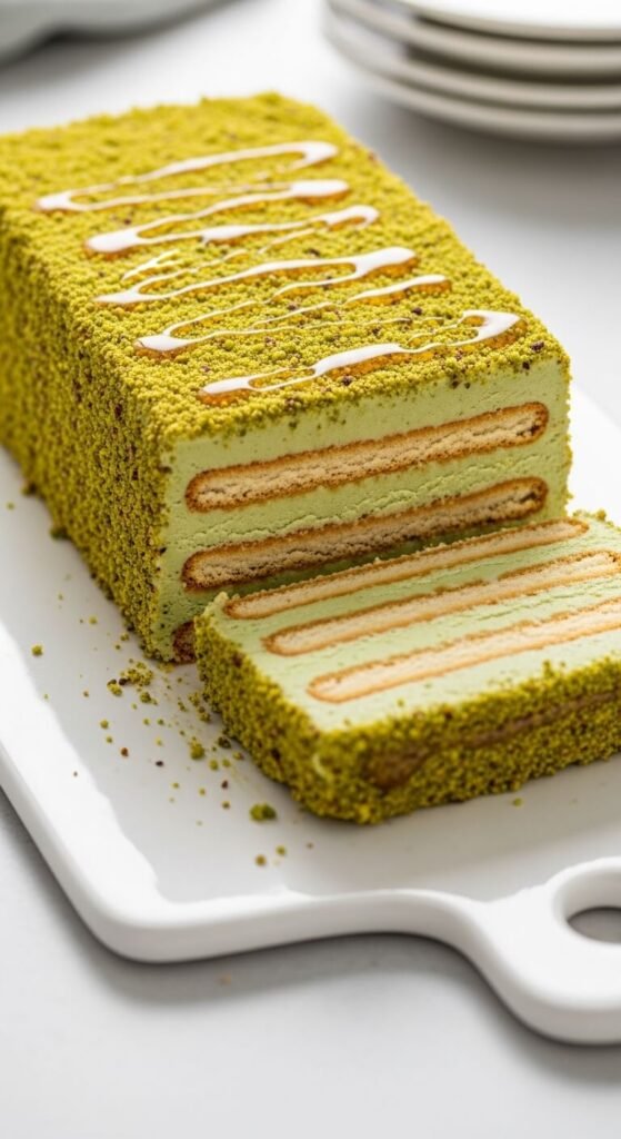 Pistachio-flavored cream, vanilla wafers, and a ground pistachio exterior produce an elegant, distinctively flavored icebox cake with a natural sage green cream that requires no food coloring. Fold three tablespoons of finely ground pistachios and one tablespoon of honey into two cups of sweetened whipped cream. Layer with vanilla wafers in a loaf pan. Refrigerate overnight. Unmold. Press finely ground pistachios firmly against the exterior cream surface — they adhere to the slightly tacky surface and hold completely. Drizzle honey in a thin, casual pattern across the pistachio-covered top. The all-over pistachio exterior with the pale green interior visible when sliced is one of the most visually distinctive presentations in this list.