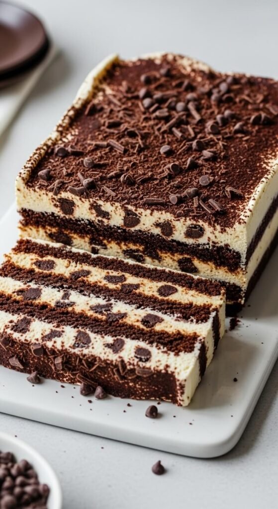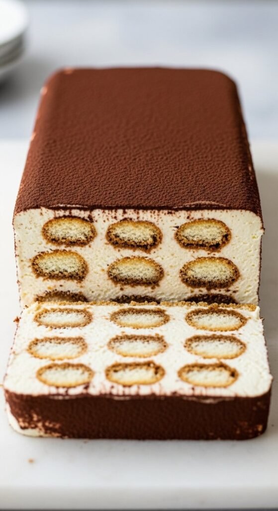 Ladyfingers dipped briefly in cold espresso, layered with mascarpone whipped cream in a loaf pan and dusted with cocoa produces tiramisu in icebox cake format — with the clean cross-section of a loaf-pan presentation rather than the casserole dish version. Dip each ladyfinger for exactly one second per side — longer produces soggy layers that lose structural integrity when unmolded. Beat mascarpone with cream, powdered sugar, and vanilla to firm peaks for the most stable cream layer. Refrigerate overnight. Unmold and dust the entire exterior surface with Dutch-process cocoa through a fine sieve. The unmolded loaf format reveals clean layers from every angle simultaneously.