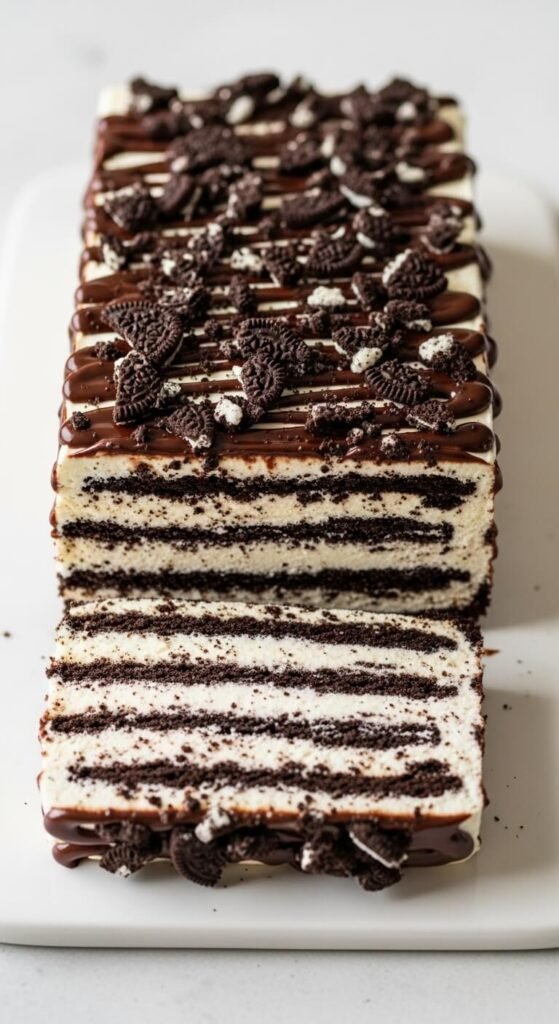 Alternating whole Oreos and sweetened whipped cream in a loaf pan overnight produces an icebox cake with a distinctly more chocolatey, cookie-forward flavor than the standard chocolate wafer version — because the Oreo filling adds an additional sweetness layer that the wafer alone doesn’t provide. Use whole Oreos rather than crushing them — the whole cookie absorbs the cream moisture more evenly and produces cleaner layer boundaries when sliced. Refrigerate overnight. Unmold and add a chocolate ganache drizzle plus a generous scatter of crushed Oreos across the top surface for a finished appearance. Slice with a warm knife for the cleanest stripe reveal. Serves 8 to 10 for about $7.