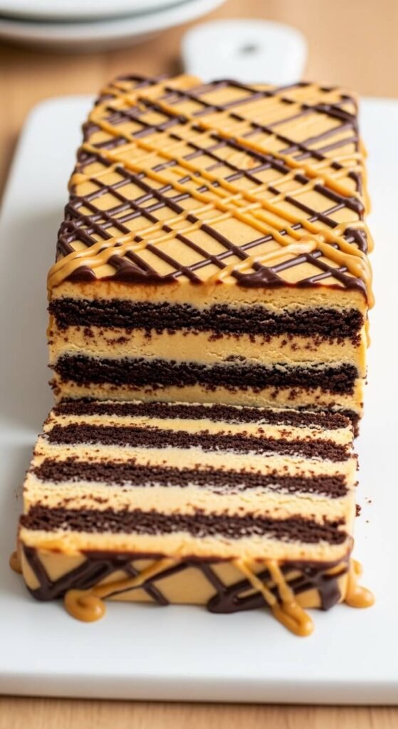 Dark chocolate wafer cookies layered with peanut butter whipped cream produce an icebox cake that tastes like a Reese’s cup in sliceable, crowd-feeding form. Add ½ cup of creamy peanut butter beaten completely smooth to two cups of whipped cream before layering — the peanut butter adds density and flavor without collapsing the cream structure. Layer with chocolate wafers in a loaf pan. Refrigerate overnight. Unmold and add both a chocolate ganache drizzle and a warm peanut butter drizzle in crossing diagonal lines across the top surface. The two-tone drizzle signals both flavors from the first glance and makes the top surface look professionally finished.