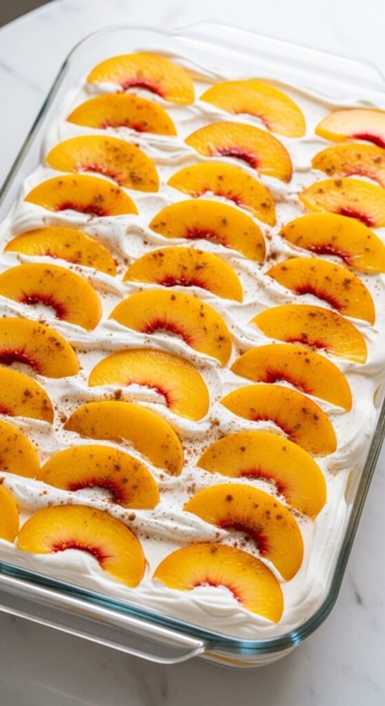 Graham crackers, sweetened whipped cream, and fresh peach slices layered overnight produce a summer icebox cake that is one of the most seasonal, most requested versions on this list during peach season. Lightly macerate sliced peaches in one tablespoon of sugar and a squeeze of lemon juice for 15 minutes. The juice that releases will soak into the graham cracker layers during chilling, carrying peach flavor throughout. Use graham crackers rather than chocolate wafers — the cinnamon note in the crackers amplifies the peach flavor naturally. Top the finished surface with overlapping peach slices and a light cinnamon dusting. Budget tip: peak-season peaches at farmers markets cost about $1.50 per pound.