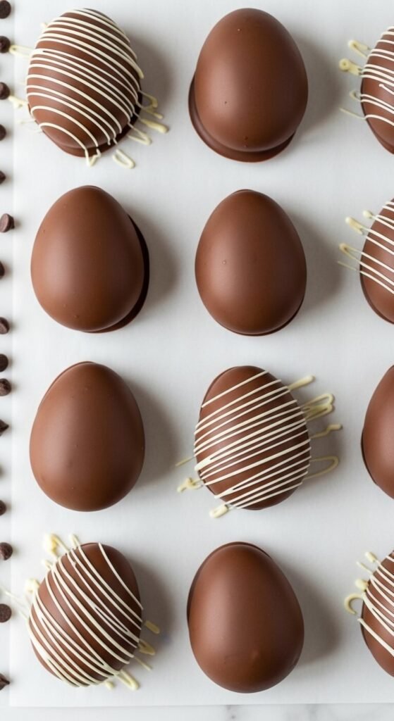 These are homemade Reese’s eggs and they are genuinely better than the store-bought version. Mix peanut butter, powdered sugar, and a pinch of salt into a stiff dough. Shape into egg forms, refrigerate until firm, then dip in melted milk chocolate. Let them set on parchment and drizzle with white chocolate for a finished look. Keep refrigerated until 30 minutes before serving. A jar of peanut butter and a bag of chocolate chips is your entire ingredient list. These keep for up to two weeks in the fridge, so make them well in advance without any stress.