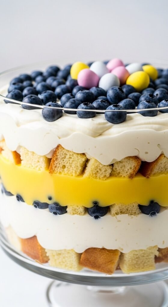 A trifle bowl is one of the most dramatic dessert presentations possible. Layer cubed store-bought pound cake with vanilla bean pudding, lemon curd, and whipped cream. Repeat the layers and finish with pastel candy eggs and fresh berries on top. The layers visible through the glass sides are genuinely stunning. Using store-bought pound cake cuts your prep time in half and keeps costs manageable. Refrigerate the assembled trifle for at least two hours before serving. This feeds a large crowd effortlessly and looks like it took hours to put together. One of the easiest crowd-pleasers on this list.