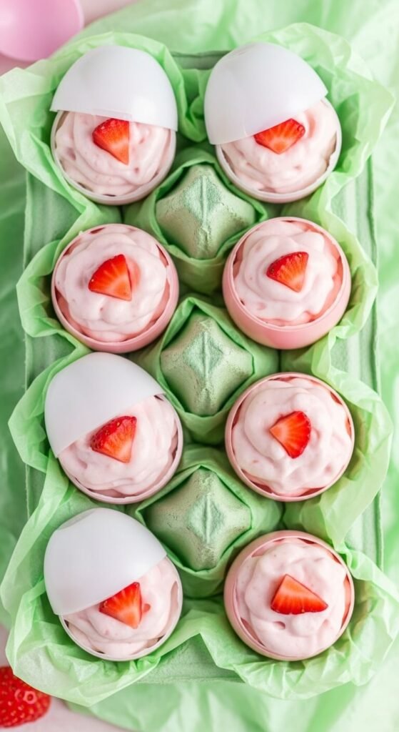 This is one of those ideas that makes guests stop and actually say “wow.” Use large plastic Easter egg halves as serving cups. Fill each half with a strawberry cream cheese mixture — cream cheese, strawberry jam, and powdered sugar whipped smooth. Serve them nestled in an egg carton lined with tissue paper as a tray. The presentation is completely unique and the dessert inside is genuinely delicious. Plastic egg halves from a dollar store work perfectly. Fill them right before serving so they stay fresh. Kids go absolutely wild for the presentation.