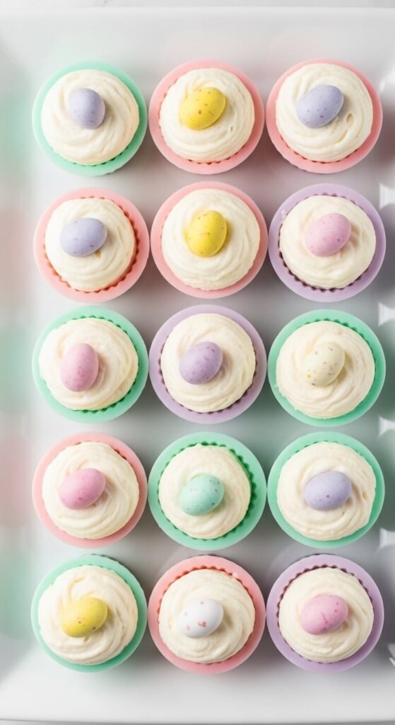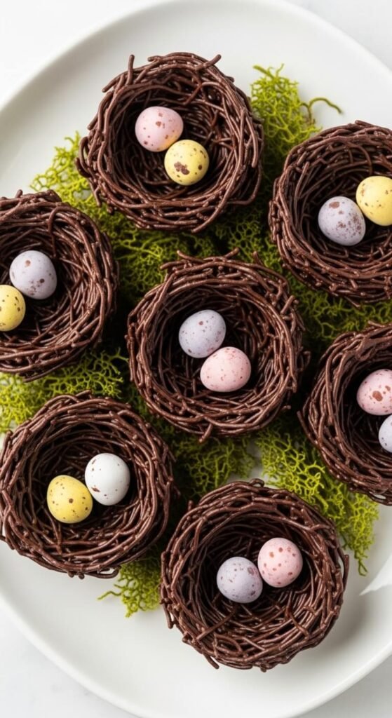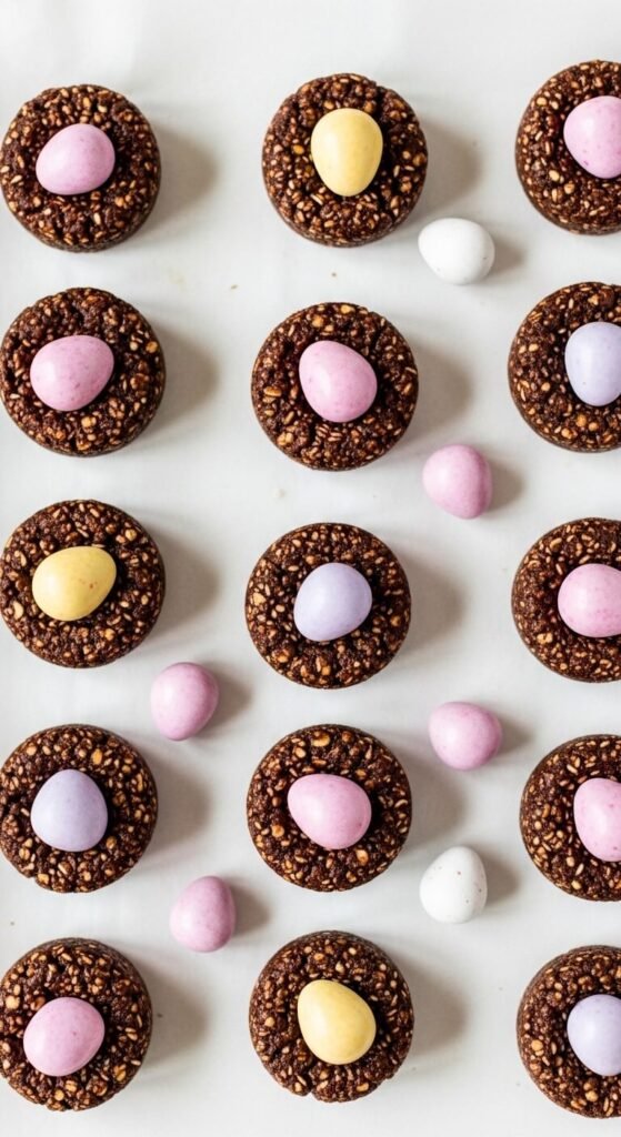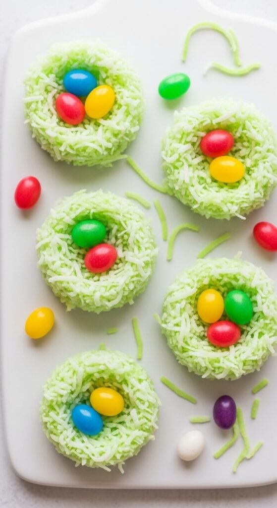 These are coconut bird’s nests but with a chewy, macaroon-style base instead of chocolate noodles. Mix shredded coconut with sweetened condensed milk and a few drops of green food coloring. Shape into small nest forms on parchment. Refrigerate until firm — about one hour. Fill each nest with three small jelly beans or candy eggs. The green-tinted coconut looks exactly like a little grass nest. A can of sweetened condensed milk and a bag of shredded coconut covers a large batch. These hold up well on a table for several hours without refrigeration.