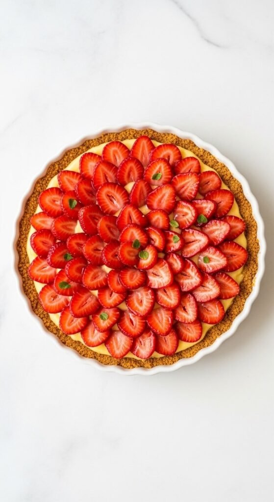 This tart looks like it came from a French patisserie and takes about 20 minutes to assemble. Press a graham cracker crust into a tart dish and refrigerate for 30 minutes. Spread a layer of lemon curd mixed with whipped cream cheese over the crust. Arrange sliced strawberries in overlapping concentric circles from the edge to the center. Brush with a little warmed apricot jam for a glossy finish. The flavor combination of tangy lemon and sweet strawberry is a spring classic. Make the base the night before and add the strawberries the morning of your event.