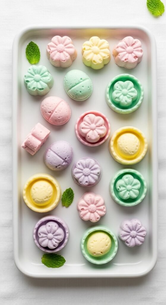 These old-fashioned cream cheese mints are a Southern Easter staple for a reason. Mix softened cream cheese with powdered sugar and peppermint extract until a smooth, firm dough forms. Divide into portions and tint each one a different pastel color using gel food coloring. Press into small candy molds or roll into small balls and flatten with a fork. Let them air-dry on parchment for one hour until the exterior firms up slightly. A block of cream cheese and a bag of powdered sugar makes about 60 mints. Store at room temperature for up to three days or refrigerate for a week.