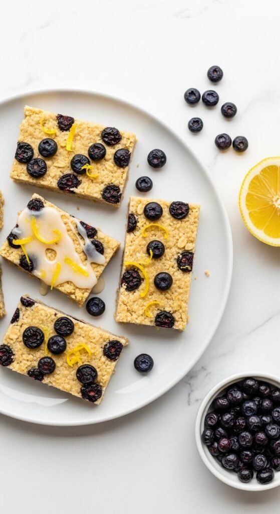 Dried blueberries hold their shape in granola bars better than any other dried fruit — they stay plump, slightly chewy, and distribute evenly throughout the oat mixture without clustering. Add the zest of one large lemon directly to the warm honey-cashew butter binder so the citrus oils infuse fully before the dry ingredients go in. Cashew butter is lighter than peanut or almond butter and lets the lemon flavour come through more clearly. Drizzle a simple lemon powdered sugar glaze over the top. These are ideal for spring and summer batch prep when lighter flavours are more appealing.