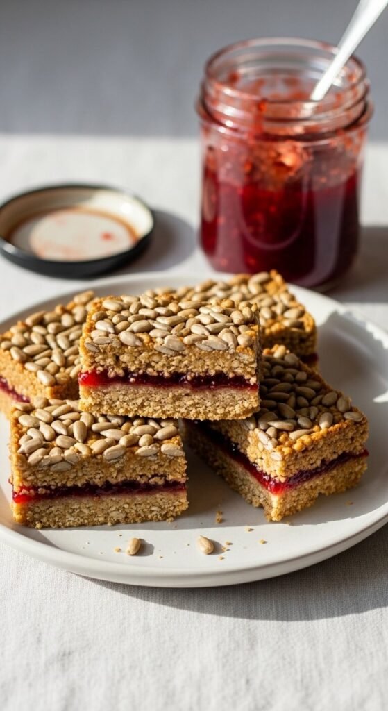 A jam layer pressed between two thin oat layers creates a granola bar that looks like a lot more work than it actually is. Press half the sunflower butter-honey-oat mixture into the pan, spread a generous layer of your favourite jam (strawberry, raspberry, and apricot all work well), then press the remaining oat mixture firmly on top. Refrigerate for at least three hours before slicing so the layers set cleanly. Sunflower butter makes this recipe nut-free, which is ideal for school lunchboxes. Budget tip: store-brand jam works identically to premium brands in this recipe.