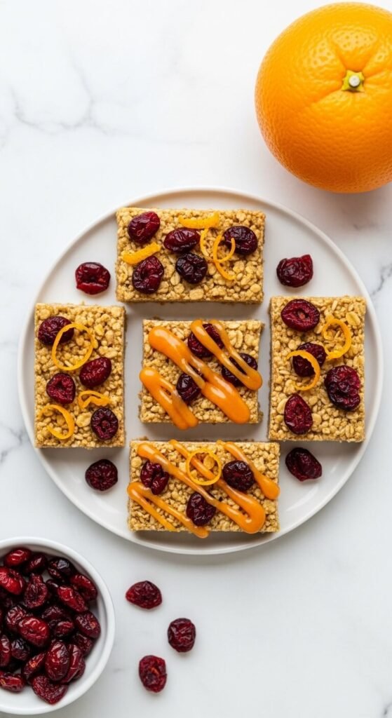 Dried cranberries are tart, chewy, and visually striking against a golden oat base — and they pair with orange in a way that feels both seasonal and effortless. Add the zest of one large orange to the warm honey-cashew butter binder. The citrus oils infuse the entire mixture and make the cranberry flavour pop more than it would without them. Mix in oats, a pinch of cinnamon, and the dried cranberries. Press into a pan and drizzle an orange-powdered sugar glaze over the set bars before cutting. These are a natural choice for fall and winter batch prep and holiday gifting.