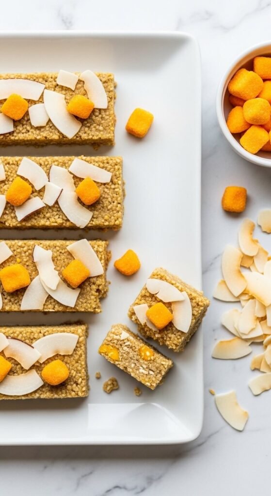 Freeze-dried mango ground into a coarse powder adds concentrated tropical sweetness and a vivid orange tint without any moisture. Stir the powder directly into the warm coconut oil-honey binder before adding oats — it infuses the entire batch with mango flavour. Fold toasted shredded coconut into the oat mixture and press extra coconut and whole freeze-dried mango pieces into the top surface. Use coconut oil as the fat source throughout for a consistent tropical flavour. These bars travel well, hold together at room temperature better than most, and smell genuinely wonderful when you open the container.