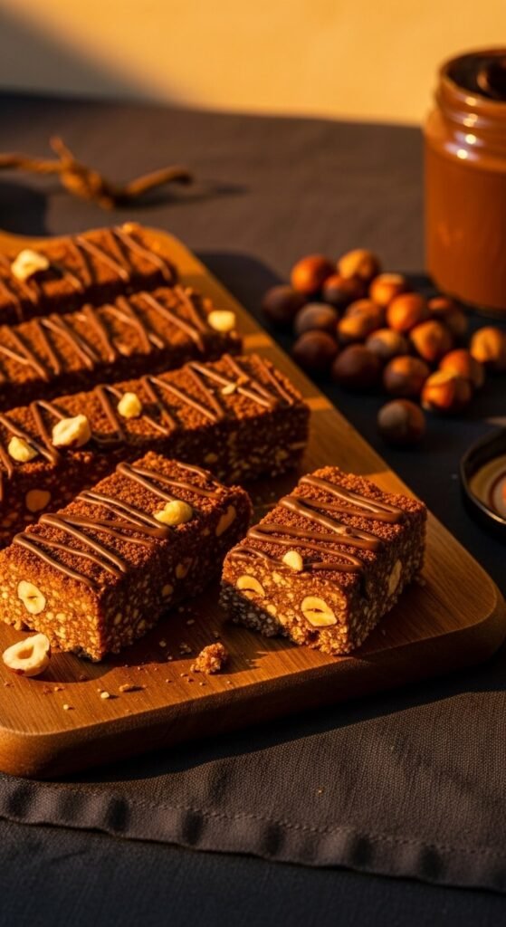 Rough-chopped roasted hazelnuts and two tablespoons of cocoa powder stirred into the warm honey-hazelnut spread binder create a bar that tastes remarkably like a Ferrero Rocher in oat form — nutty, chocolatey, and genuinely satisfying. Hazelnut spread (Nutella or any equivalent) replaces standard nut butter here as the binder. It provides fat, sweetness, and flavour all at once, which means less additional sweetener is needed. Drizzle extra warmed hazelnut spread over the pressed, chilled bars. Top with whole roasted hazelnuts pressed in before chilling. These are a standout on any snack or dessert platter.