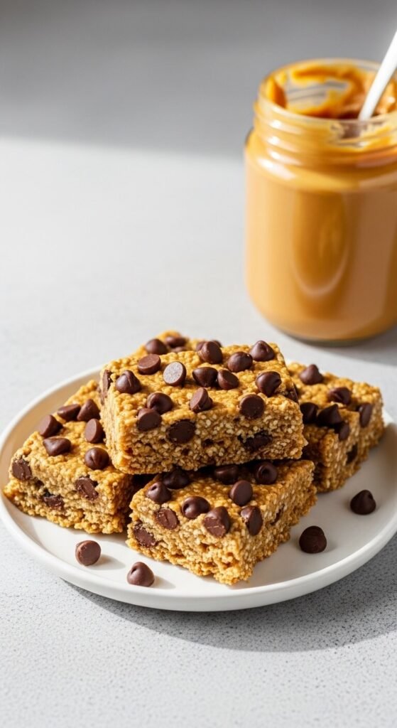 Creamy peanut butter warmed with honey creates one of the most reliable granola bar binders available — it sets firm when cold, holds the oats together without crumbling, and adds enough protein to make each bar genuinely filling. Mix with rolled oats, a pinch of salt, vanilla, and fold in mini chocolate chips after the mixture cools slightly (hot mixture melts chips completely). Press into a pan, scatter extra chips on top, and refrigerate. These are the bars kids ask for in lunchboxes and adults eat standing in front of the fridge. Make a double batch.