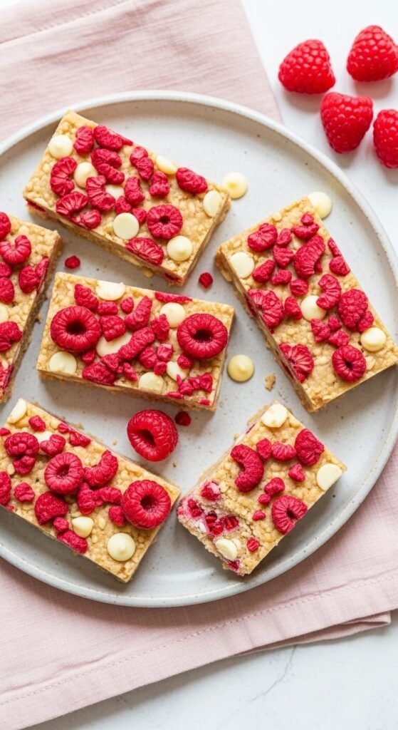 Freeze-dried raspberries ground into a fine powder add concentrated tartness and a natural pale pink tint to the entire bar when stirred into the warm binder. Fold whole freeze-dried raspberry pieces into the oat mixture alongside white chocolate chips for sweetness that balances the raspberry’s sharpness. Press into a pan and scatter extra raspberry pieces and chips across the top before chilling. The tartness of the raspberry against the creamy white chocolate creates a combination that tastes considerably more sophisticated than a standard granola bar. These are crowd-pleasers at events and easy to wrap individually for gifting.