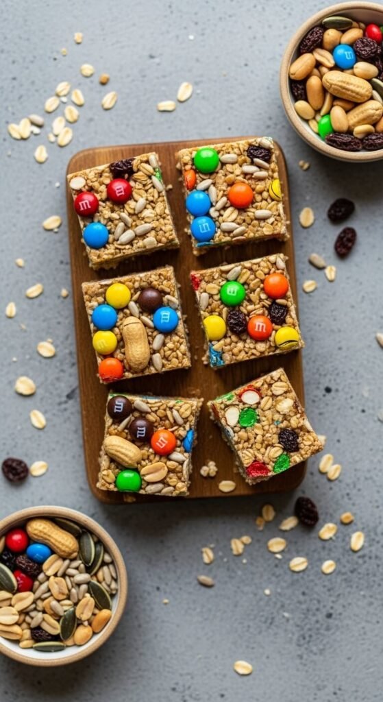 This is the easiest recipe on the list to customise with whatever is already in your pantry. Use the standard honey-peanut butter binder with rolled oats, then fold in one full cup of trail mix — any combination of M&Ms, raisins, peanuts, sunflower seeds, and dried cranberries works. The mix-ins hold together in the oat base and create a different combination in every bar. Kids love making these because they can choose their own trail mix components. Make a few bars with one mix and a few with another in the same pan for variety across a single batch.