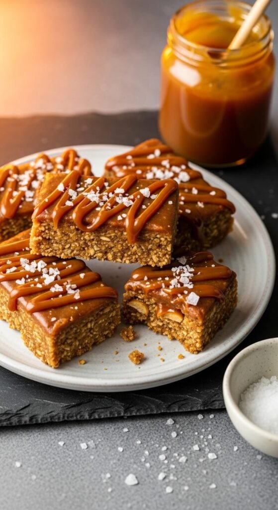 Store-bought caramel sauce stirred into the warm butter-honey binder adds a rich, buttery sweetness that standard honey alone can’t achieve. Use about three tablespoons of thick caramel sauce alongside the honey and reduce the nut butter slightly to keep the binder from becoming too loose. Fold in rolled oats and press firmly into the pan. While still warm, drizzle extra caramel sauce across the top and scatter flaky Maldon sea salt generously before chilling. The caramel sets slightly sticky on top — which is exactly what makes these irresistible. Cut with a hot knife for clean edges.
