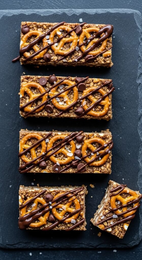 Three flavours — salty pretzel, creamy peanut butter, and dark chocolate — in one bar that takes about 15 minutes to put together. Warm peanut butter and honey together as the binder, add rolled oats, and fold in roughly crushed salted pretzels and mini chocolate chips. The pretzel pieces add crunch and saltiness throughout. Press into a pan, drizzle dark chocolate over the top, scatter extra pretzel pieces and flaky sea salt, and refrigerate. Eat on day one for maximum pretzel crunch, or after two days when the pretzels have softened into a chewier texture. Both versions are excellent.