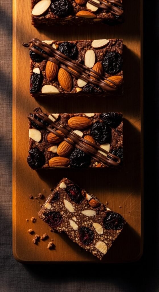 Dried tart cherries add a jewel-like colour and a sharp, fruity contrast that makes these bars taste considerably more complex than a standard recipe. Use almond butter as the binder, warmed with maple syrup and a pinch of sea salt. Fold in rolled oats, sliced almonds, and rough-chopped dried cherries. Press into the pan and drizzle melted dark chocolate across the top before refrigerating. The chocolate sets into a thin, snappy layer that makes the first bite satisfying in a way plain granola bars rarely achieve. Keep them cold for the cleanest slices.