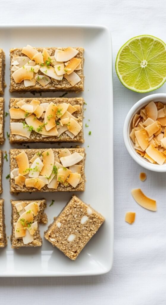 Toasted coconut folded into the oat mixture adds a warm, nutty sweetness that plain coconut can’t replicate — three minutes in a dry pan is all it takes. Use coconut oil (melted) and honey as the binder for a fully tropical flavour base. Add the zest of two limes directly to the warm binder mixture so the citrus oils infuse before the oats go in. The lime cuts through the coconut richness and adds brightness that makes these bars taste lighter than most. Press with extra toasted coconut on top. These are a natural fit for summer snack prep.