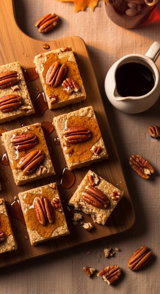 Pure maple syrup used as the sweetener instead of honey creates a distinctly different flavour — less floral, more woody and warm. It works particularly well with toasted pecans, which bring a buttery richness that standard nuts don’t match. Toast pecans in a dry pan for four minutes until fragrant, rough-chop, and fold into the oat-maple binder mixture. Press into the pan and arrange extra whole pecans across the top surface before chilling. This bar tastes like pecan pie filling in a portable rectangle. Use grade B (dark) maple syrup for the deepest, most assertive maple flavour.