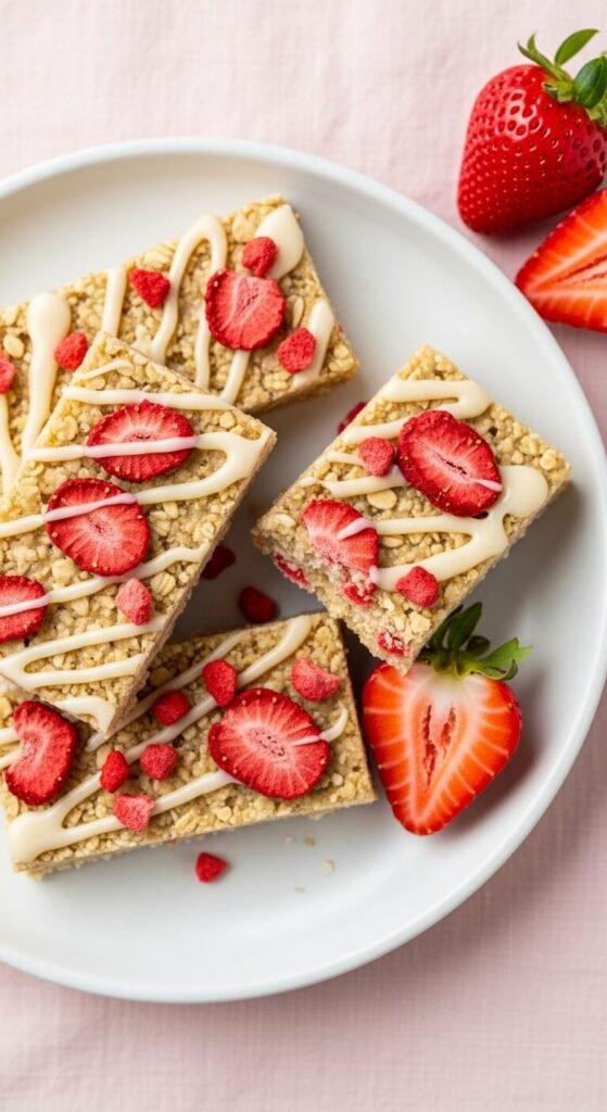 Freeze-dried strawberries are the key ingredient that makes these bars work — they add concentrated fruit flavour without the moisture that fresh fruit would introduce, which would make the bars sticky and structurally unstable. Roughly crush the freeze-dried strawberries and fold half into the warm oat-honey-almond butter mixture. Press into the pan and scatter the remaining pieces on top. Make a quick vanilla glaze from powdered sugar, vanilla extract, and a teaspoon of milk, then drizzle across the chilled, set bars. These are particularly popular with children and work well as a lunchbox option.