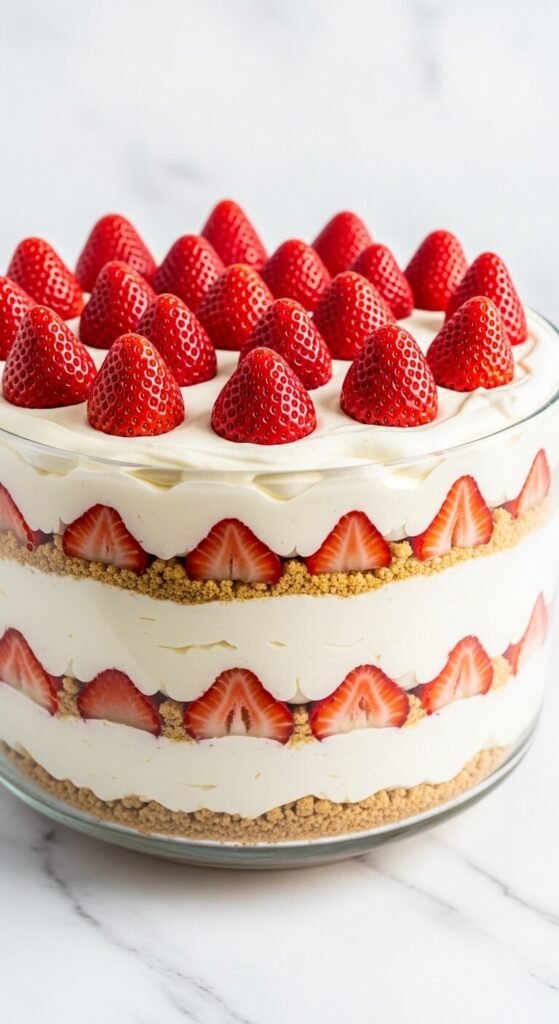 Strawberry cheesecake trifle combines two beloved desserts into one layered bowl that satisfies both camps at once. Crush graham crackers with a little sugar for the base layer. Make the cheesecake filling by beating cream cheese with powdered sugar and a splash of vanilla until smooth, then fold in whipped cream to lighten it. Layer the crumble, cheesecake cream, and sliced fresh strawberries, repeating twice. Top with whole fresh strawberries arranged closely together across the surface. Use frozen strawberries for the inner layers and fresh ones only for the decorative top — this halves the fruit cost significantly. Serves twelve for about $11 total.