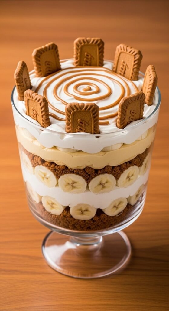 Biscoff and banana is the trifle combination that sounds too good and then absolutely delivers. Crush Biscoff biscuits roughly for the base layer. Make the Biscoff cream by beating cream cheese with Biscoff spread, powdered sugar, and vanilla until smooth, then folding in whipped cream. Layer the crumbles, banana slices, and Biscoff cream, repeating twice. Top with a swirl of melted Biscoff drizzled across the cream and Biscoff biscuits pressed into the top rim of the bowl. Use just-ripe bananas — overripe ones turn the cream brown after a few hours. A jar of Biscoff spread costs $4. Serves twelve for about $10.