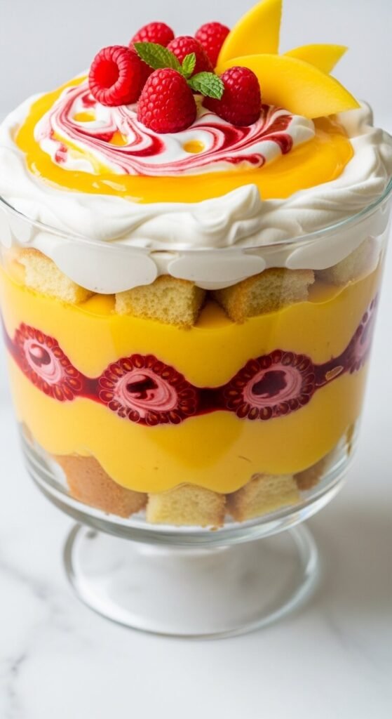 The ripple effect in this trifle is created by folding slightly — just two or three folds — a raspberry coulis through the mango cream before layering. Fold whipped cream with mango purée until smooth for the base mango cream. Stir a raspberry coulis into a small portion of additional whipped cream. Spoon alternating spoonfuls of mango cream and raspberry cream into the trifle bowl and drag a skewer through them in a figure-eight to create the ripple. The visual effect of the orange and red swirl through the clear glass is striking and genuinely worth the small extra effort. Frozen mango and raspberries together cost about $6. Serves ten for about $10.