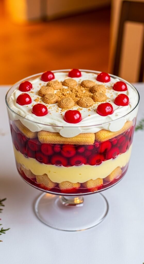 A Christmas trifle for a crowd is the most forgiving large-format dessert for a holiday table — it serves twenty, can be made two days ahead, and looks spectacular on any table without any last-minute assembly. Make a red jelly layer from cranberry juice dissolved with gelatin and suspend glacé cherries within it for a festive visual effect. Layer over sherry-soaked sponge fingers, then add carton custard and whipped cream. Top with glacé cherries in a circular pattern, crushed amaretti biscuits in the center, and a fine dusting of gold luster sugar. Cranberry juice costs $2. Glacé cherries cost $2. A full bowl serves twenty for about $16.