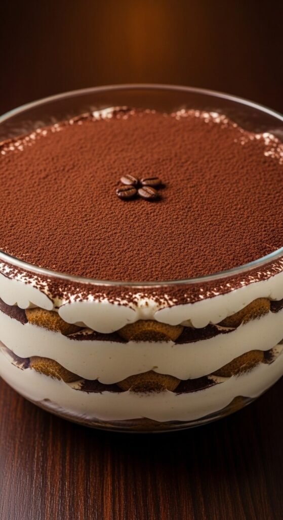 A tiramisu trifle brings the classic Italian dessert into a format that serves twenty and takes no individual portioning. Briefly dip sponge fingers in cold strong espresso — do not soak them fully or they will become waterlogged — and layer in a large glass bowl. Cover with mascarpone whipped with powdered sugar and a splash of vanilla. Dust generously with cocoa powder. Repeat three times. The cocoa layer between each round is what separates tiramisu trifle from a plain cream trifle — do not skip it. Refrigerate overnight. A full bowl costs about $14 and serves sixteen to eighteen people. The classic coffee bean garnish on top takes five seconds.