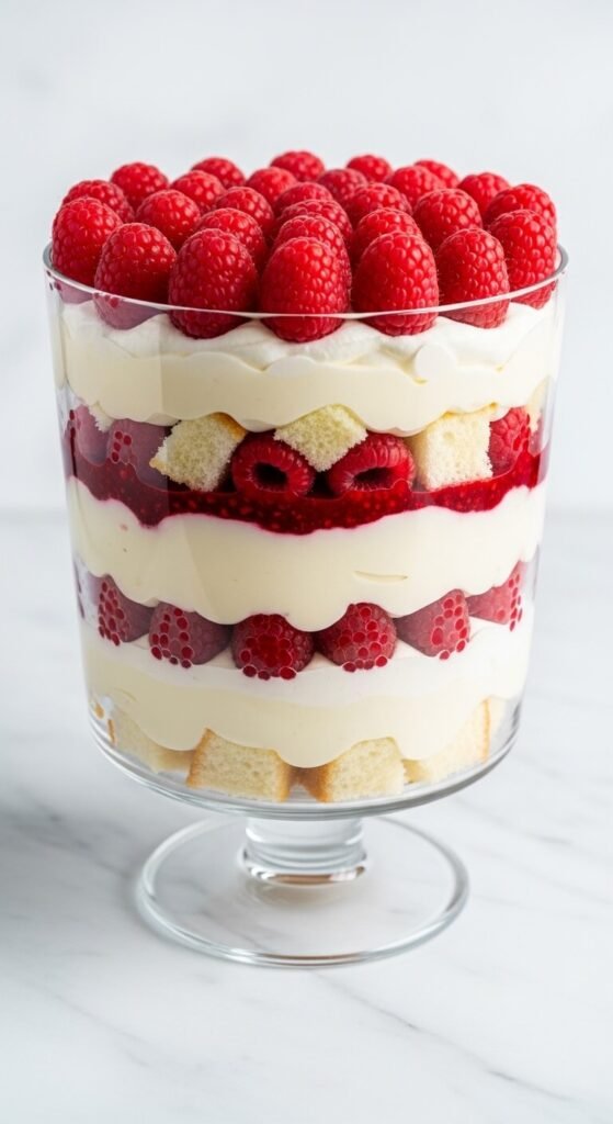 White chocolate mousse and fresh raspberry is a pairing that produces one of the best-looking trifles in the glass. Layer white sponge cake or pound cake chunks with a white chocolate mousse — melted white chocolate folded into whipped cream — and a layer of fresh or frozen raspberry sauce. Repeat twice and top with fresh whole raspberries packed closely together across the surface. The dark red raspberry on top against the ivory white chocolate underneath creates a dramatic color contrast that makes this trifle the most photographed one on the table. Frozen raspberries for the sauce cost $3. A full trifle serves twelve for about $13.