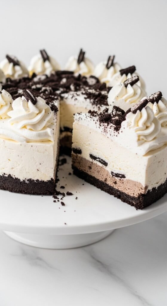 Three alternating layers — Oreo crust, cookies and cream ice cream, and crushed Oreo crumble — stacked in a springform pan creates a cookies and cream cake that looks extraordinary in cross-section. Press one Oreo crust layer into the base and freeze. Add cookies and cream ice cream, freeze until solid, then add a second thinner crumb layer on top before covering with whipped cream. The middle crumb layer creates a visual stripe in each slice. Scatter whole Oreos and extra crumbles across the top. This is one of the most requested ice cream cake flavours for good reason — it appeals to almost every age group.