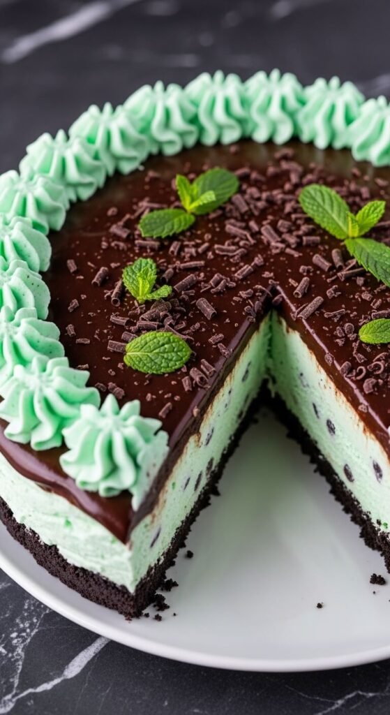 A dark chocolate Oreo crust, a thick layer of mint chocolate chip ice cream, a poured dark chocolate ganache top, and mint green whipped cream piped around the border creates one of the most visually striking flavour combinations available in ice cream cake form. The ganache top gives the cake a finished, professional appearance that whipped cream alone can’t achieve. Add fresh mint leaves and dark chocolate shavings scattered across the ganache surface before serving. The ganache needs to be completely cooled to room temperature before pouring over the frozen ice cream layer — hot ganache will melt the surface.