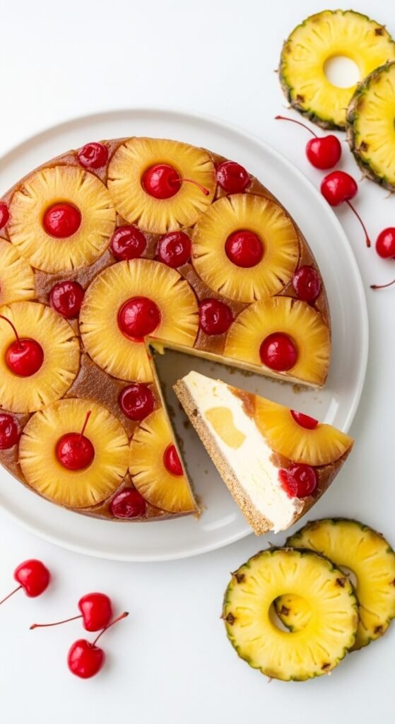 Press the crust into the top of the springform pan rather than the base, arrange pineapple rings with maraschino cherries in the centers directly on the bottom of the pan (which will become the top when inverted), pour a thin layer of caramel sauce over the arrangement, and fill with softened pineapple or vanilla ice cream. Freeze overnight, then invert onto a serving plate. The pineapple ring pattern is revealed when the pan releases. This is a visual showstopper that takes no more effort than a standard ice cream cake — just assembled in reverse. The tropical flavour combination is ideal for summer outdoor parties.