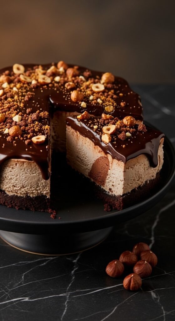 A chocolate biscuit crust, hazelnut ice cream or Nutella-swirled vanilla ice cream, a dark chocolate ganache top, and roughly crushed hazelnut praline scattered across the surface makes this the most elegant ice cream cake on this list. Make the praline simply: heat sugar in a dry pan until amber, add whole hazelnuts, pour onto parchment, and break into pieces when cool. No thermometer needed. Scatter the praline pieces across the ganache just before serving — not before refreezing, or the praline will soften and lose its snap. This cake is ideal for adult birthday celebrations where chocolate-heavy desserts are the preference.